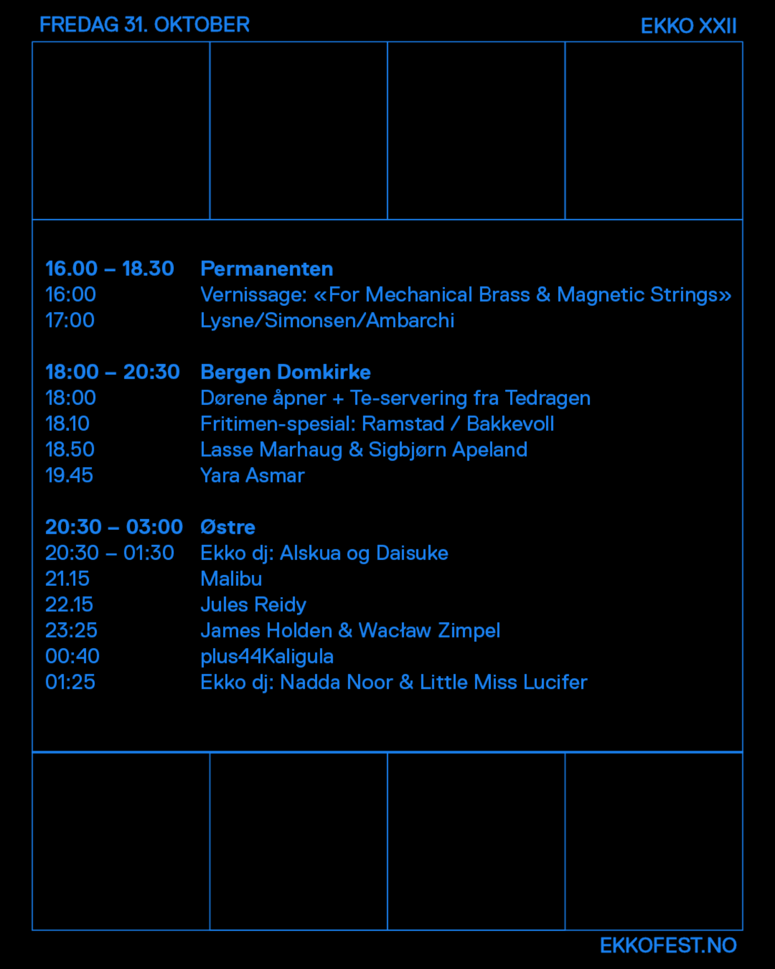 Fritimen er Østres åpne scene for eksperimentell musikk og fri improvisasjon – et sted der musikere møtes uten noter, regler eller sjangre. I Domkirkens våpenhus får vi en egen festivalutgave av prosjektet, der August Ramstad og Jakob Bakkevoll åpner rommet for et spontant musikalsk møte. Fritimen handler om å lytte, reagere og bygge noe kollektivt – der lyden oppstår i øyeblikket og forsvinner like fort. Det er improvisasjon i sin reneste form, et lite pusterom mellom konsertene, hvor kirkerommets akustikk og tilfeldighetene spiller med.
