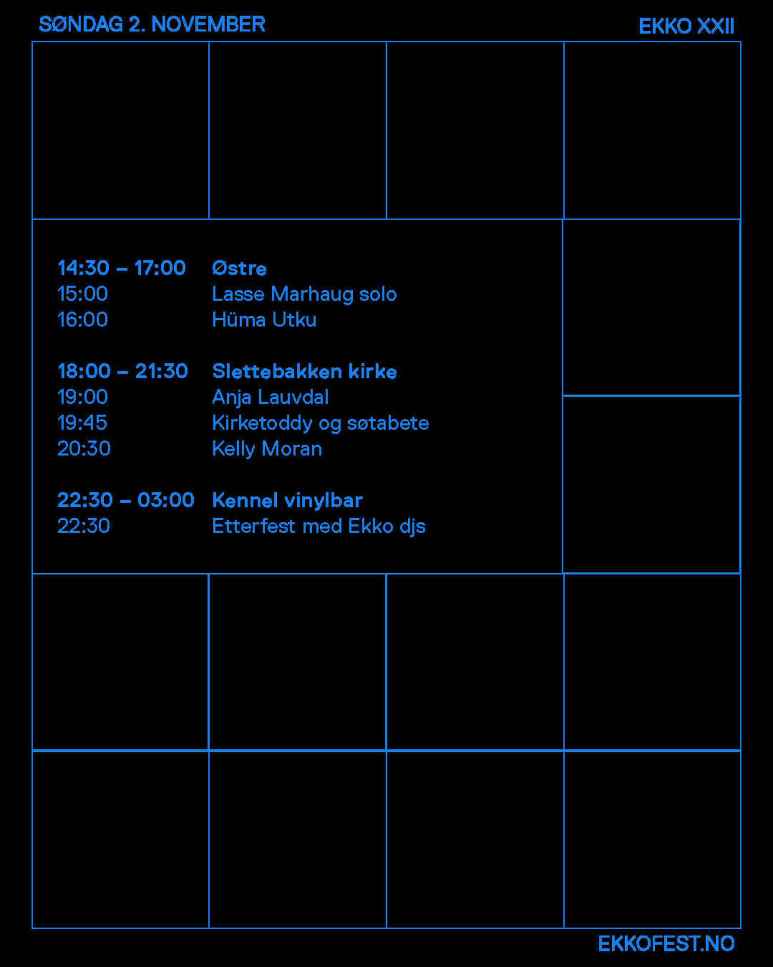 Siste dagen av Ekko XXII. Her finner du den siste utgaven av vår daglige guide til festivalen. Du kan se hele tidsplanen her. Alle arenaene åpner i god tid før konsertstart.