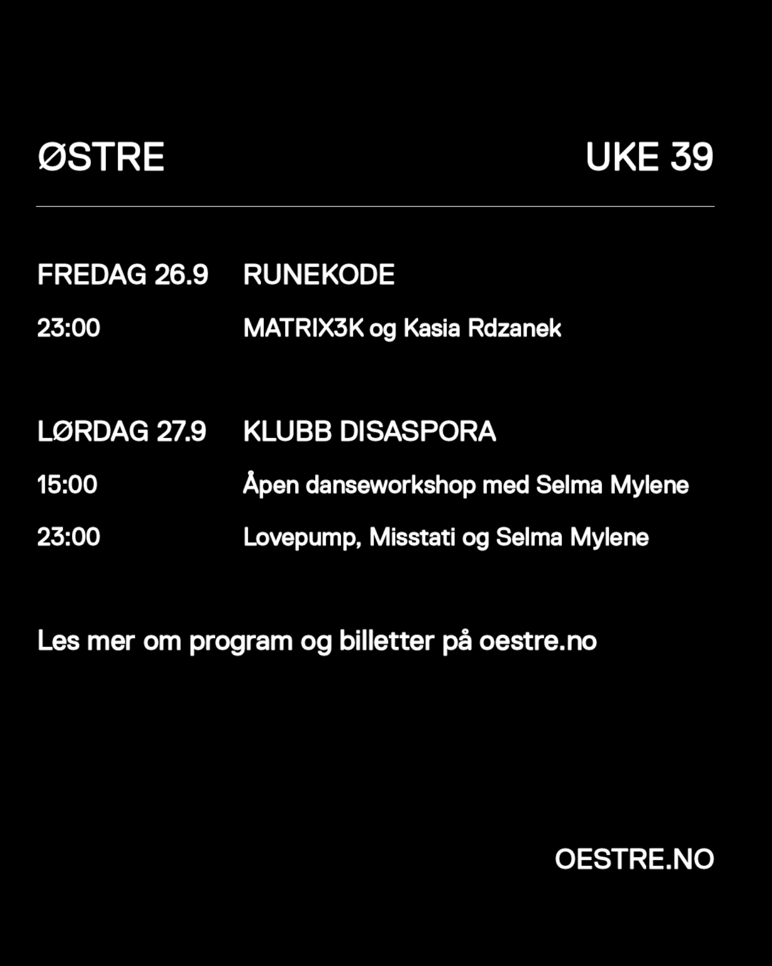 Lørdag skrus temperaturen opp når Klubb Diaspora vender tilbake til Østre. Først med en åpen afro house–workshop ledet av Selma Mylene, og senere med en danseperformance. Resten av natten leverer Love Pump og Multitati som alltid et energisk og eklektisk utvalg: amapiano, kuduro, baile funk, afrobeats og mye mer. En kveld fylt med dansesirkler, kollektiv eufori og rytmer som løfter både kropp og rom.